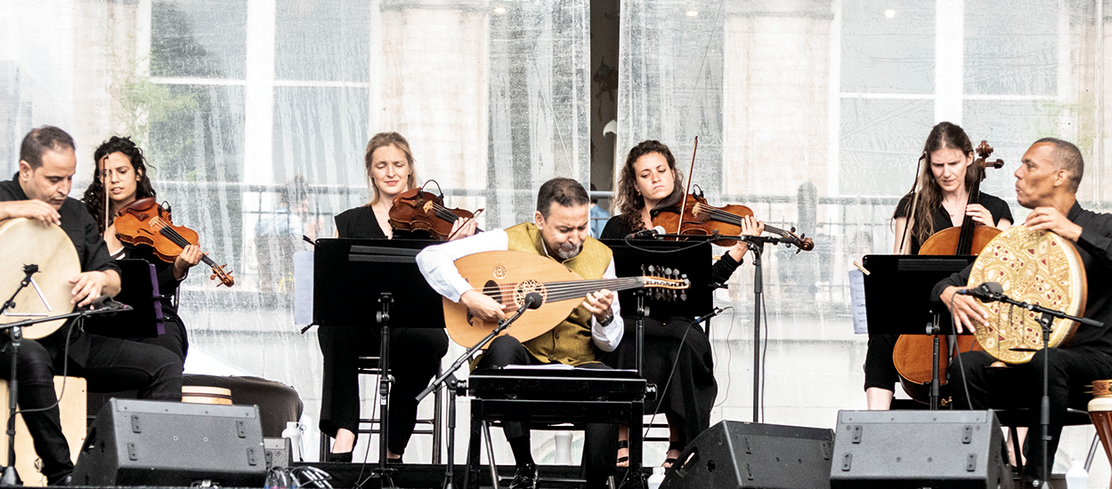 Le ’magicien du oud’ marocain originaire d’Agadir Driss El Maloumi qui s’accompagne ici de ses deux percussionnistes Saïd El Maloumi et de Lahoucine Baqir pour ce projet, réunit cinq musiciens belges pour concevoir un univers musical alliant le classique européen à la musique arabe ! Le Watar Quintet qui est composé de Amèle Metlini (1erviolon), Silvia Bazantova (2eviolon), Marie Ghitta (violon alto), Annemie Osborne (violoncelle) et d’Adrien Tyberghein (contrebasse) apporte ainsi tout l’univers des cordes classiques aux percussions et surtout au oud (un luth) cet instrument à cordes pincées répandu dans les pays arabes, en Arménie ou en Grèce.